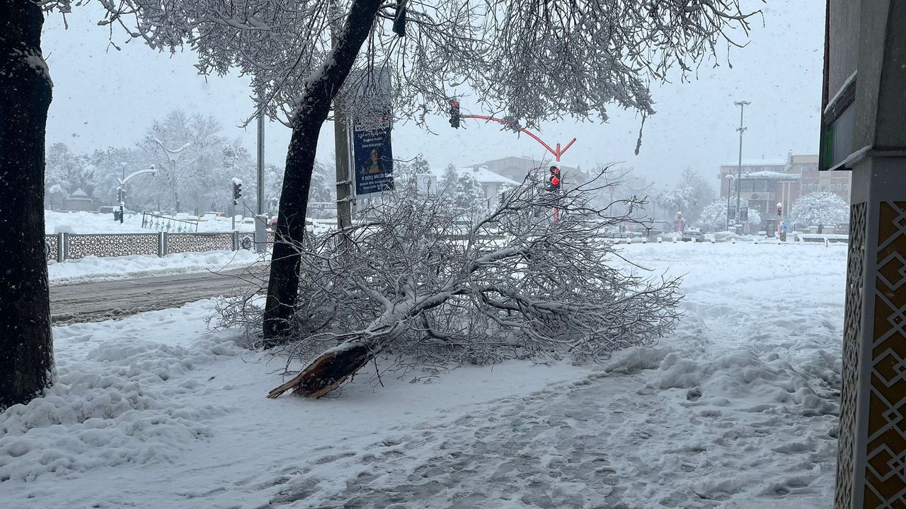 Erzincan’da etkili olan kar yağışı nedeniyle ana caddelerde ve bazı mahallelerde ağaç dalları ağırlığa dayanamayarak devrildi.