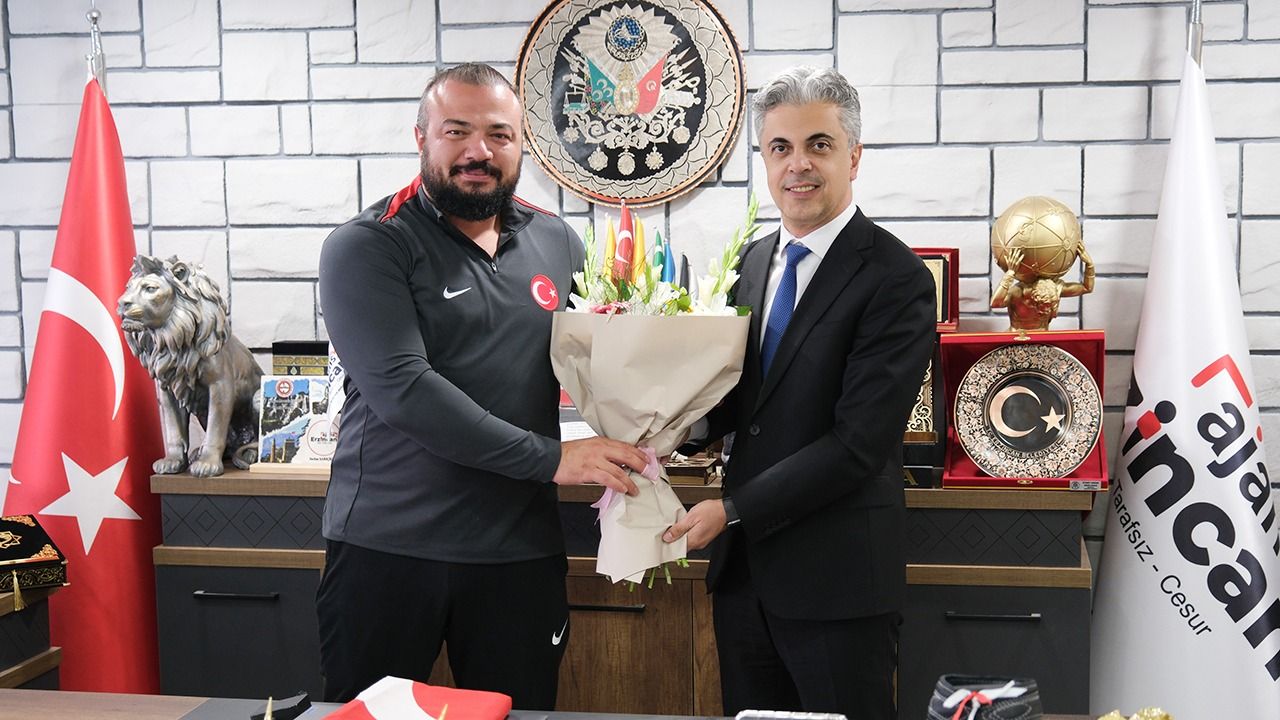 Mengücek Gazi Eğitim ve Araştırma Hastanesi Başhekimi Prof. Dr. Ufuk Kuyrukluyıldız, Macaristan’da düzenlenen Veteranlar Dünya Güreş Şampiyonasında Dünya 3.sü olarak büyük bir başarıya imza atan Milli Güreşçi Serhat Sarıçiçek’e tebrik ziyaretinde bulundu.