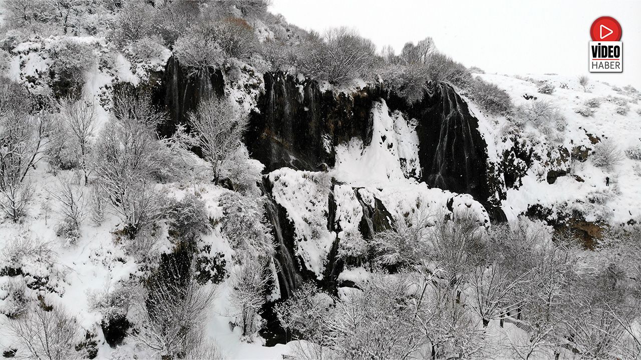 Erzincan'da doğal güzelliğiyle öne çıkan Girlevik Şelalesi, etkili olan kar yağışının ardından beyaza bürünerek kartpostallık görüntüler oluşturdu.
