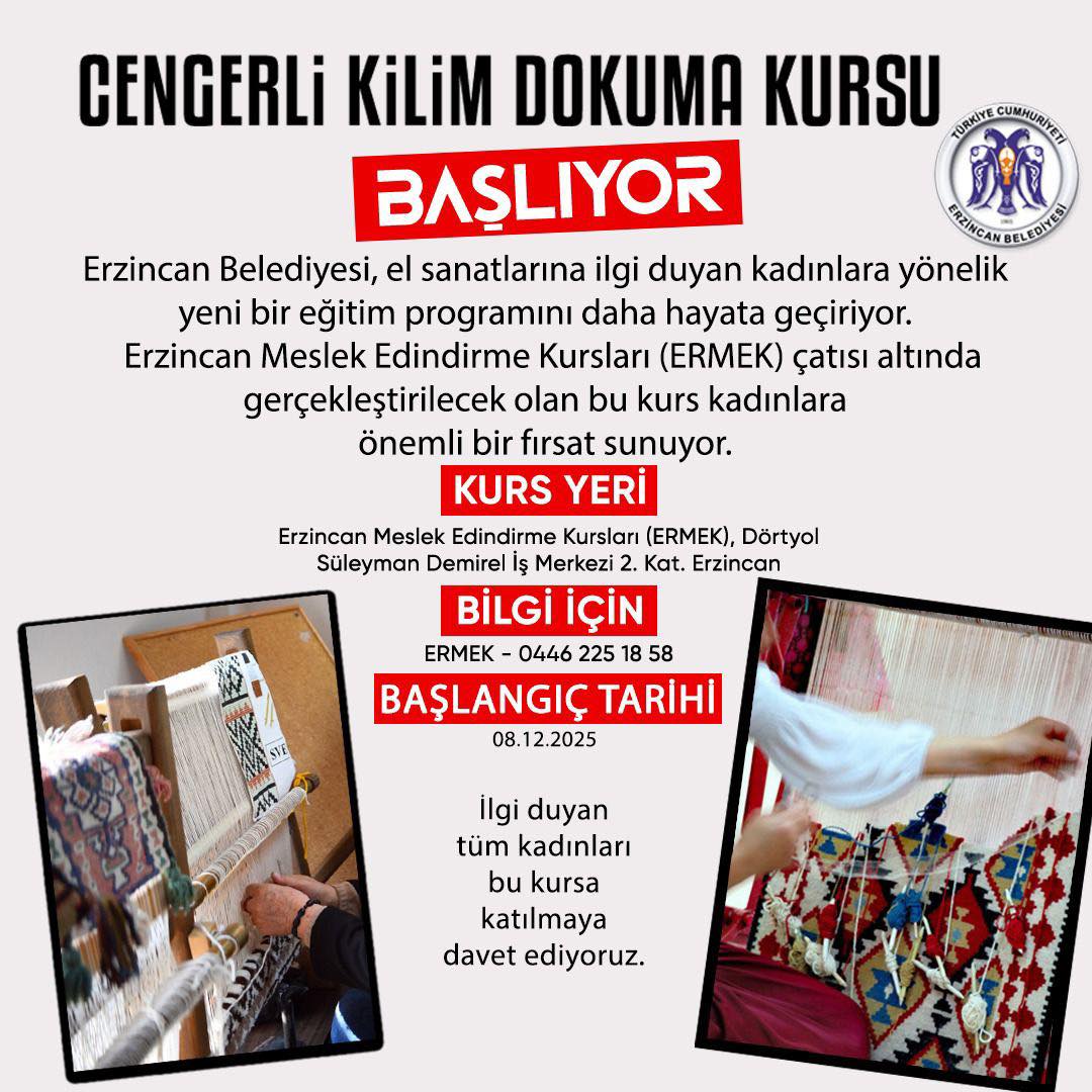 Erzincan Belediyesi, geleneksel el sanatlarını yaşatmak ve kadınlara mesleki beceri kazandırmak amacıyla önemli bir eğitim programını daha hayata geçiriyor. Erzincan Meslek Edindirme Kursları (ERMEK) bünyesinde düzenlenecek Cengerli Kilim Dokuma Kursu, hem kültürel mirası geleceğe taşımayı hem de kadınların üretim süreçlerine katılmasını hedefliyor.