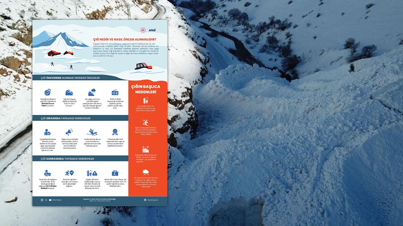 AFAD yetkilileri, kış mevsiminde artan kar yağışı, ani sıcaklık değişimleri ve rüzgâr etkisiyle birlikte özellikle eğimli arazilerde çığ riskinin ciddi seviyelere ulaşabildiğine dikkat çekti. Açıklamada, çığın; dağlık bölgelerde biriken kar kütlelerinin iç veya dış etkenlerle harekete geçerek yamaçlardan aşağı kayması sonucu oluşan, can ve mal kaybına yol açabilen ciddi bir doğal afet olduğu hatırlatıldı.