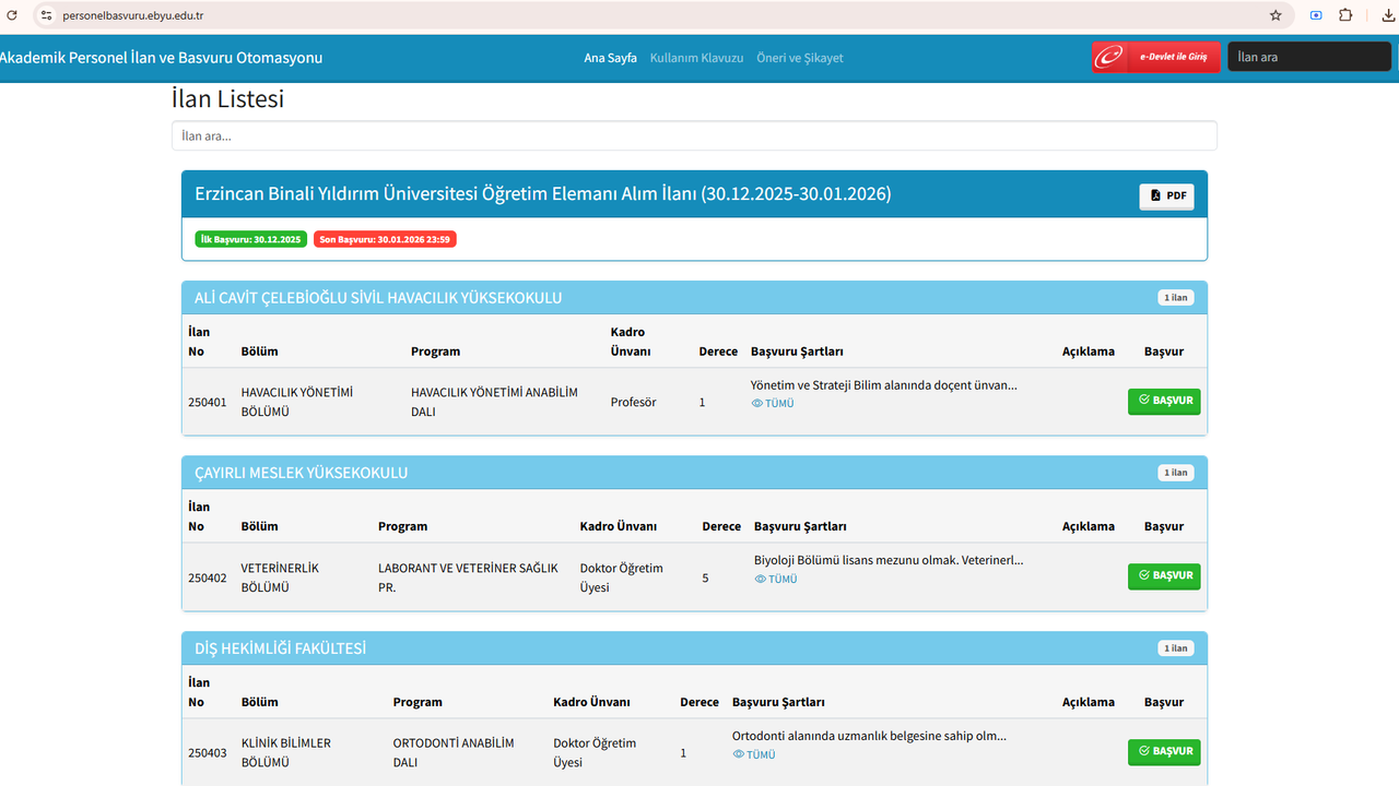 Erzincan Binali Yıldırım Üniversitesi (EBYÜ) tarafından Resmî Gazete’de yayımlanan öğretim görevlisi alım ilanına ilişkin başvuruların, https://personelbasvuru.ebyu.edu.tr/ adresi üzerinden e-Devlet sistemi aracılığıyla yapılabildiği öğrenildi.