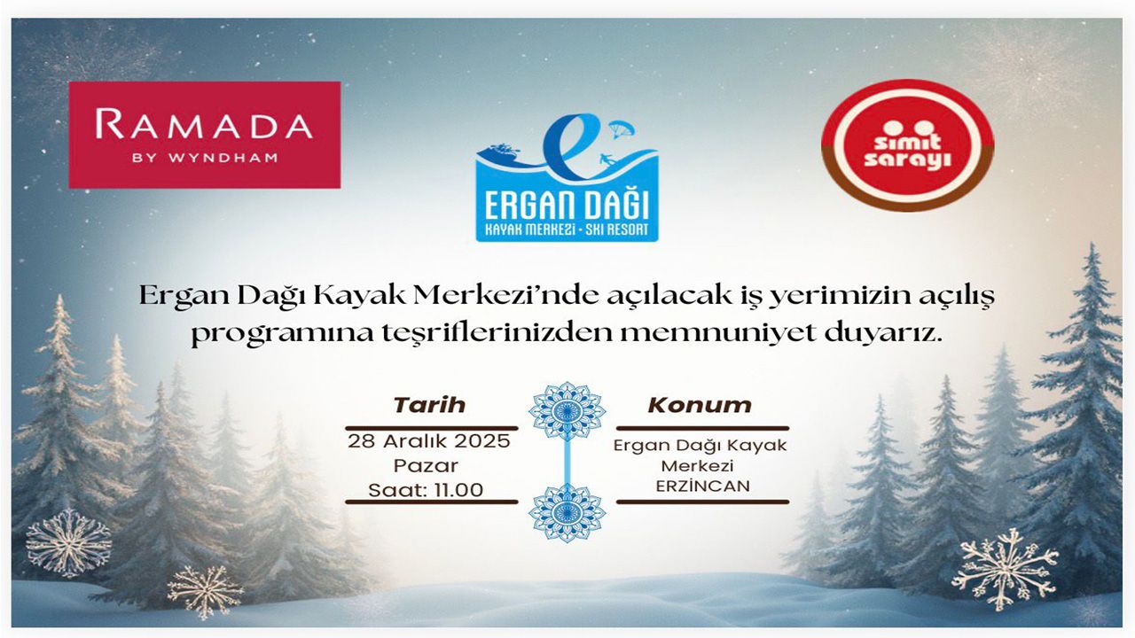 Erzincan’ın önemli kış turizm merkezlerinden Ergan Dağı Kayak Merkezi’nde yeni bir iş yeri hizmete giriyor. Ramada by Wyndham, Ergan Dağı Kayak Merkezi ve Simit Sarayı iş birliğiyle açılacak olan işletmenin açılış programı 28 Aralık 2025 Pazar günü gerçekleştirilecek.