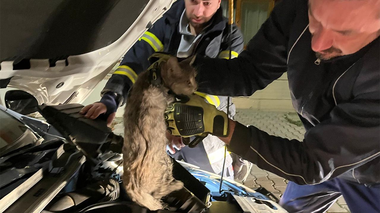 Aracını park ettiği yerden almaya giden sürücü, ön kaputtan seslerin geldiğini duydu. Kaput kapağını kaldıran sürücü, motor kısmına kedinin sıkıştığını anlayınca durumu itfaiyeye bildirdi.