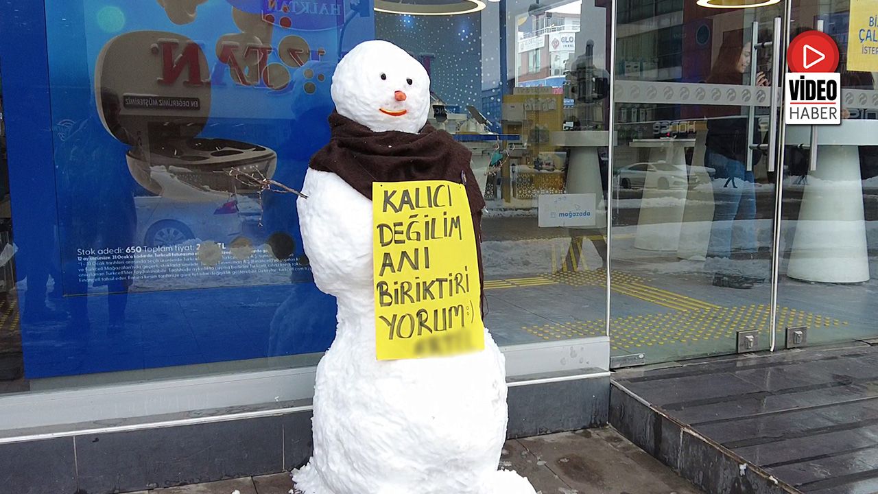 Şehir merkezinde bir iş yerinin önünde biriken kar kütlesinden yapılan kardan adam figürü, üzerine asılan esprili notla vatandaşların ilgisini çekti. “Kalıcı değilim, anı biriktiriyorum” yazısıyla sergilenen kardan adam, hem reklam çalışması hem de kar yağışının getirdiği keyifli anların simgesi oldu. Ortaya çıkan görüntüler, soğuk hava ve zorlu kış şartlarına rağmen kentte tebessüm ettirdi.