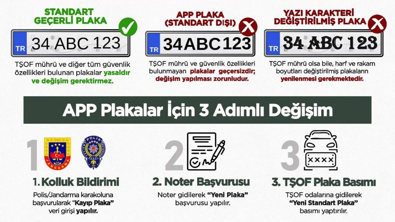 Açıklamada ayrıca standart dışı plaka kullanımının mevzuata aykırı olduğu hatırlatılarak, bu tür plakaları kullanan araç sahiplerine idari para cezası uygulanabileceği ve araçların trafikten men edilebileceği bildirildi.