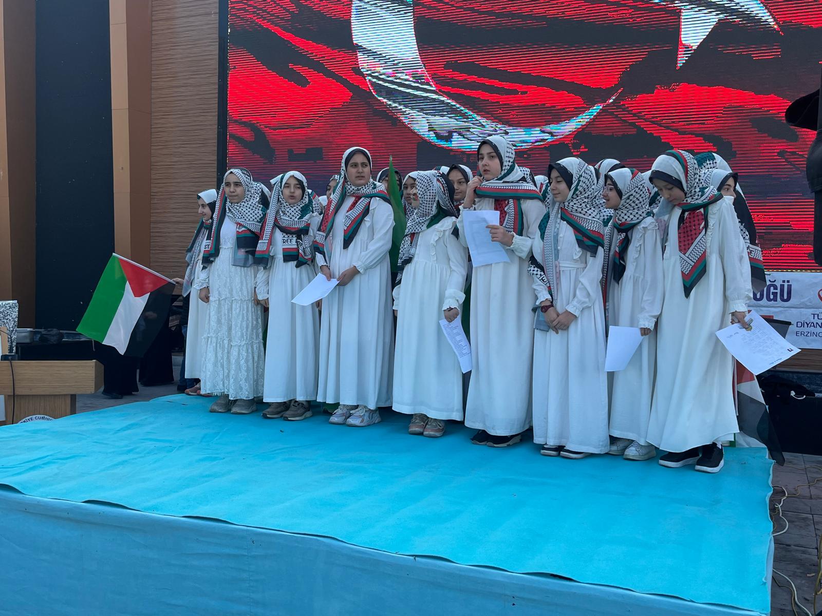 Programda, minik öğrenciler tarafından şiirler okundu ve İsrail ürünlerine karşı boykot çağrısı yapıldı. Filistin temalı ezgi dinletisi büyük beğeni kazandı.