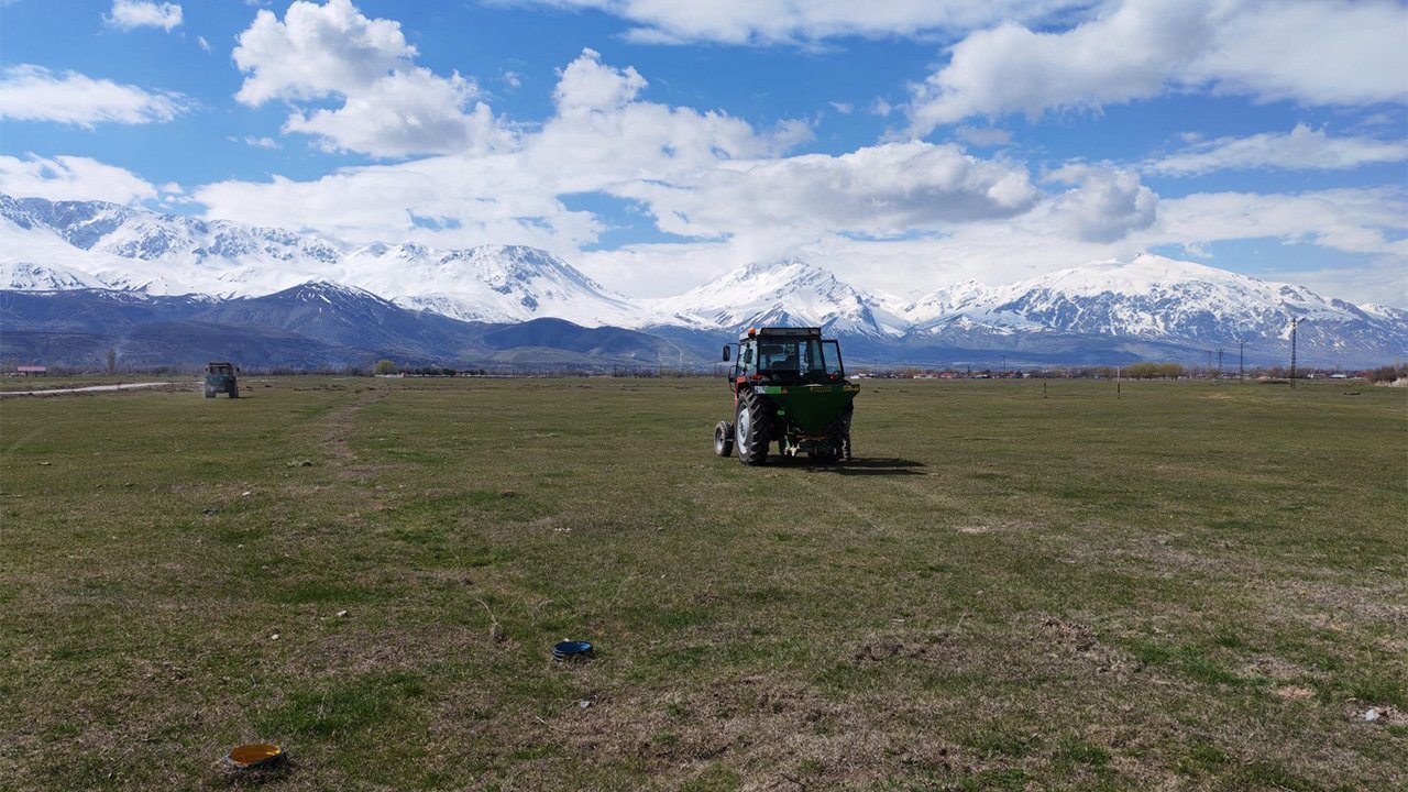 Erzincan’da baharın gelişiyle birlikte mera ıslah çalışmaları hız kazandı. Gübreleme çalışmaları 7 köyde sürerken, yeni köyler de projeye dahil edilecek.