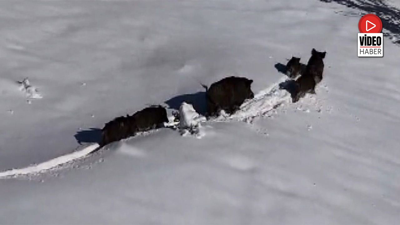 Drone kamerasına yansıyan görüntülerde, yaban domuzlarının kalın kar örtüsü üzerinde koşarak ilerlediği, zaman zaman duraksadığı ve yön değiştirerek birlikte hareket ettiği görüldü. Karla kaplı arazide uyum içinde hareket eden sürü, bir süre sonra dağlık alana doğru yönelerek gözden kayboldu.
