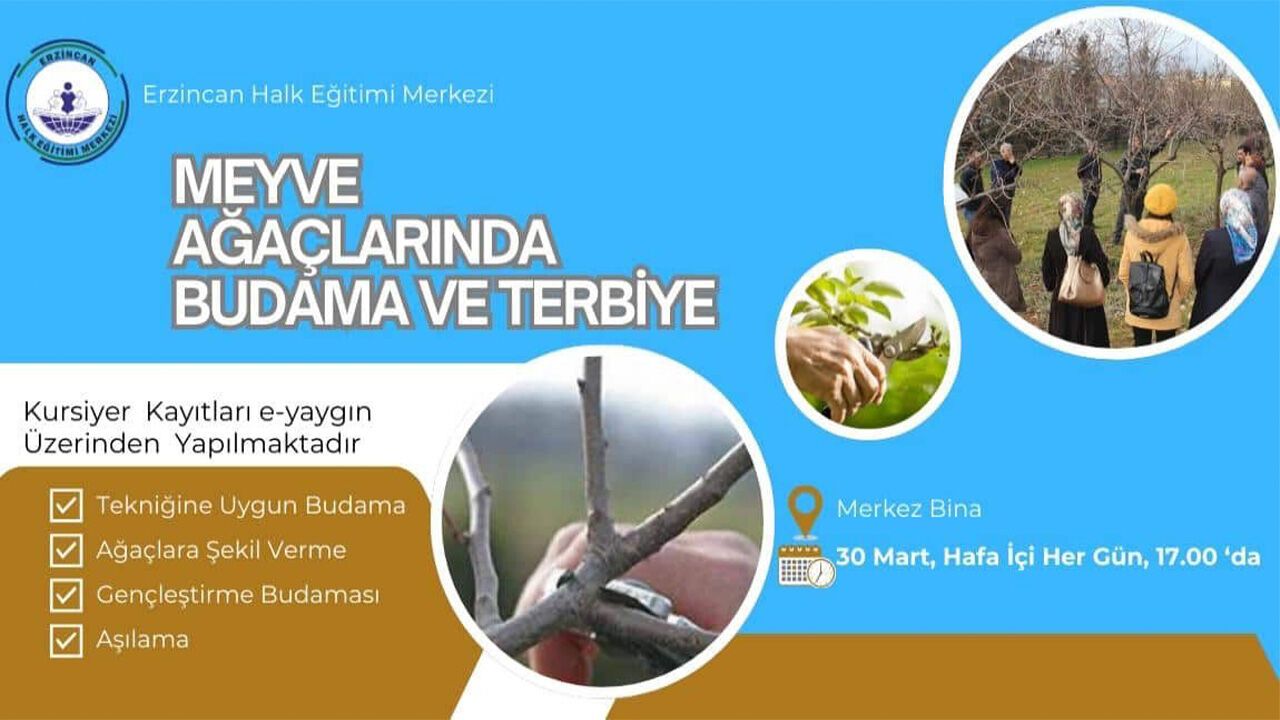 Erzincan Halk Eğitimi Merkezi, meyve yetiştiriciliğine ilgi duyan vatandaşlar için önemli bir fırsat sunuyor. "Meyve Ağaçlarında Budama ve Terbiye" kursu ile katılımcılar, meyve ağaçlarının doğru tekniklerle budanması ve şekillendirilmesi konusunda kapsamlı bilgi ve beceri edinecekler.