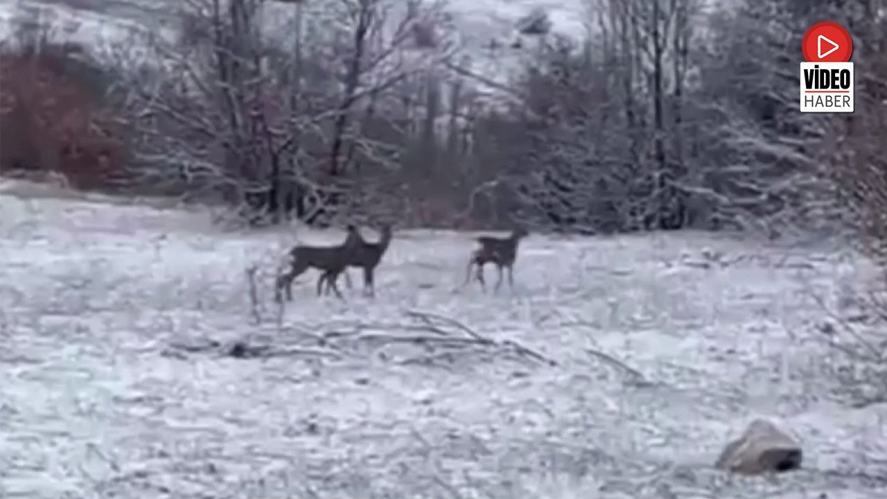 Kızıl geyikler, Erzincan'ın Refahiye ilçesinde nadir anlara sahne oldu. Kar yağışı altında doğada beslenen üç kızıl geyik, cep telefonu kamerasıyla görüntülendi.