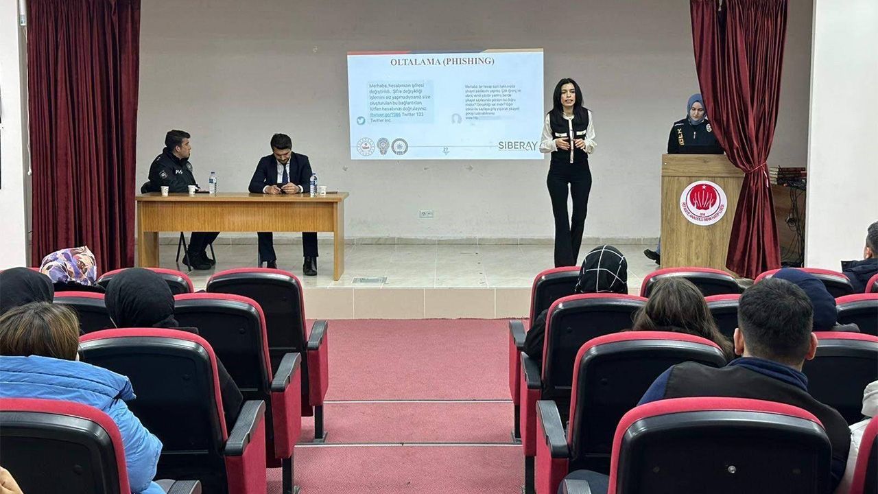 Erzincan Emniyet Müdürlüğü Siber Suçlarla Mücadele Şube Müdürlüğü ekiplerince, siber suçların önlenmesi ve dijital risklere karşı farkındalık oluşturulması amacıyla seminer düzenlendi. Emniyet birimlerince yürütülen "SİBERAY" programı kapsamında; Refahiye Anadolu İmam Hatip Lisesi ile Erzincan Binali Yıldırım Üniversitesi öğrencileri ve öğretmenlerine yönelik bilgilendirme faaliyeti gerçekleştirildi. Seminerde, teknoloji bağımlılığı, güvenli internet kullanımı, siber suçlar ve siber zorbalık konularında kapsamlı bilgiler verildi. Katılımcılara ayrıca bilgilendirici broşürler dağıtıldı. Yetkililer, dijital ortamda güvenliğin sağlanması ve siber suçların gerçekleşmeden önlenmesi amacıyla farkındalık çalışmalarının sürdürüleceğini bildirdi.