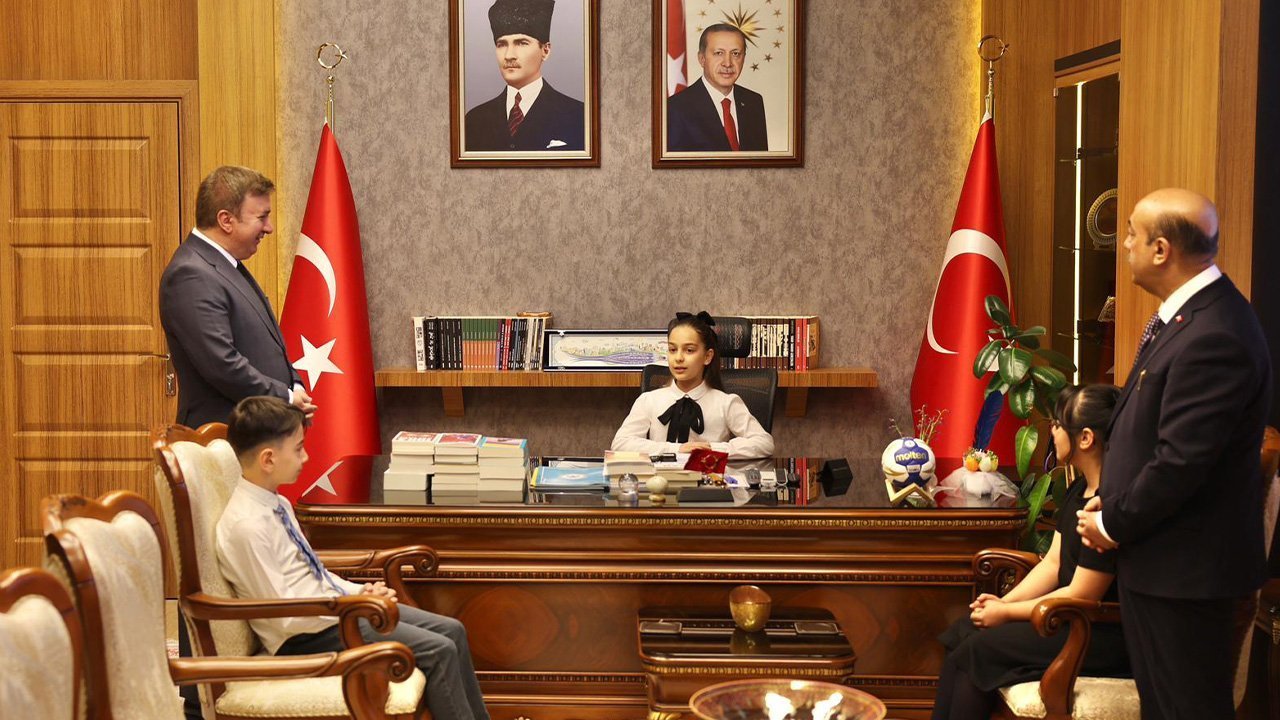 Vali Aydoğdu tarafından Valilik Binası girişinde karşılanan temsili Vali Mihriay Keskin ve beraberindeki öğrenciler, Valilik Şeref Defteri’ni imzaladıktan sonra Valilik Makamı’na geçti.
