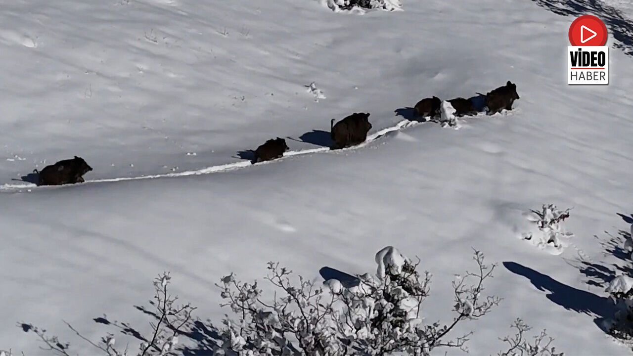Erzincan'da karlı arazide ilerleyen yaban domuzu sürüsü, havadan görüntülendi. Ortaya çıkan görüntüler, kış şartlarında yaban hayatının verdiği yaşam mücadelesini gözler önüne serdi.