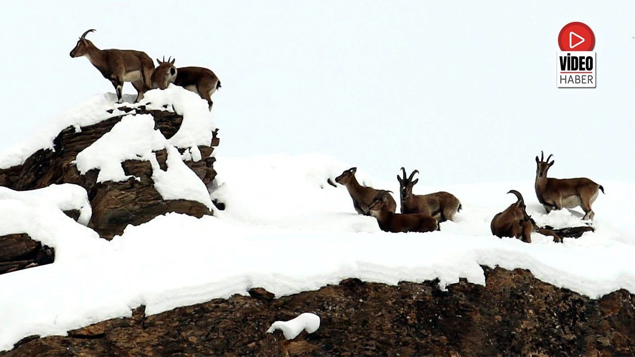 Erzincan'da zirvesi karla kaplı 3 bin rakımlı dağda sürüler halinde gezinip yiyecek arayan, avlanması yasak ve koruma altındaki tür olan dağ keçileri havadan görüntülendi.